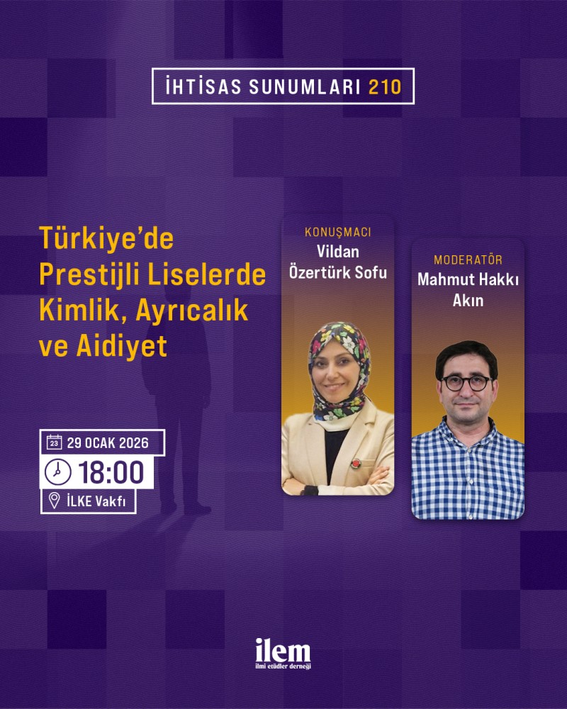İhtisas Sunumlarının 210. Etkinliği, 29 Ocak 2026 Perşembe günü saat 18:00’de İLEM’in 2026 yılı itibariyle faaliyetlerine devam edeceği binasında gerçekleşiyor. Mahmut Hakkı Akın moderatörlüğünde ve Vildan Özertürk Sofu’nun sunumuyla gerçekleşecek etkinlikte, "Türkiye’deki Prestijli Liselerde Kimlik, Ayrıcalık ve Aidiyet” başlığıyla Türkiye'deki prestijli liselerdeki elit üretimine dikkat çekilecektir.